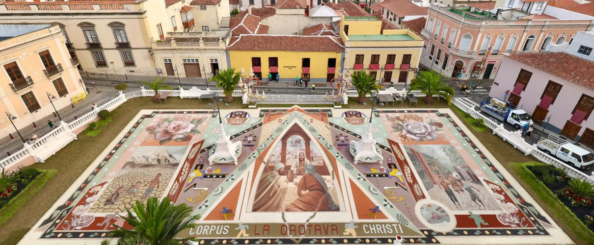 Comme chaque année, la ville de La Orotava s'habille pour recevoir ses traditionnelles festivités du Corpus Christi et, dans le cadre de son programme, les habitants exposent tous les tapis et tapisseries qu'ils ont confectionnés et qui ornent ensuite le centre de la ville. C'est un moment intense et unique de ces festivités, car il est chargé d'un grand sens religieux, où toute la ville de La Orotava s'abandonne au Créateur qui se manifeste dans l'Eucharistie.