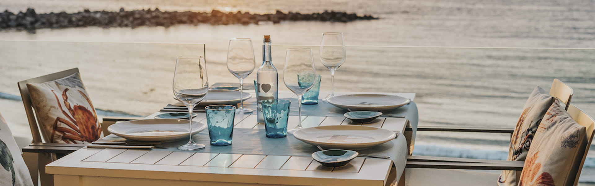 Poisson grillé, fruits de mer et paellas pour rendre hommage au produit tout en admirant la vue magnifique sur la mer, juste au-dessus de la plage de Troya. Conversations après le repas avec les parfums de l’océan, et le coucher de soleil en apéritif pour le dîner. Essence et authenticité de la matière première, accompagnées d'une cave à vin irréprochable.